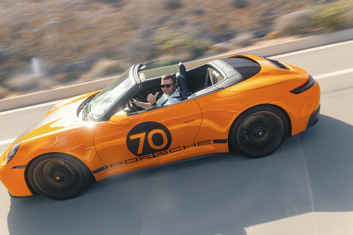 Cireașa de pe tort: 911 Spirit 70, ediție limitată la 1500 exemplare, inspirată de istoria Porsche. Bazat pe Carrera GTS, dispune de un sistem hibrid cu un mic electromotor (541 CP total, doar trei secunde până la 100 km/h). „E prima electrificare a unui 911 stradal, adaugă 50 kg, dar oferă zero turbo lag”. Pe o porțiune de drum închisă i-am experimentat toată puterea, din strat prin launch control. Priviți viteza maximă la care am ajuns și în câte secunde.