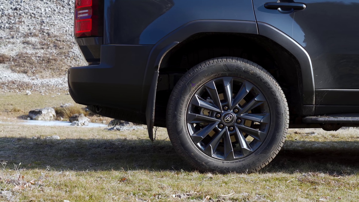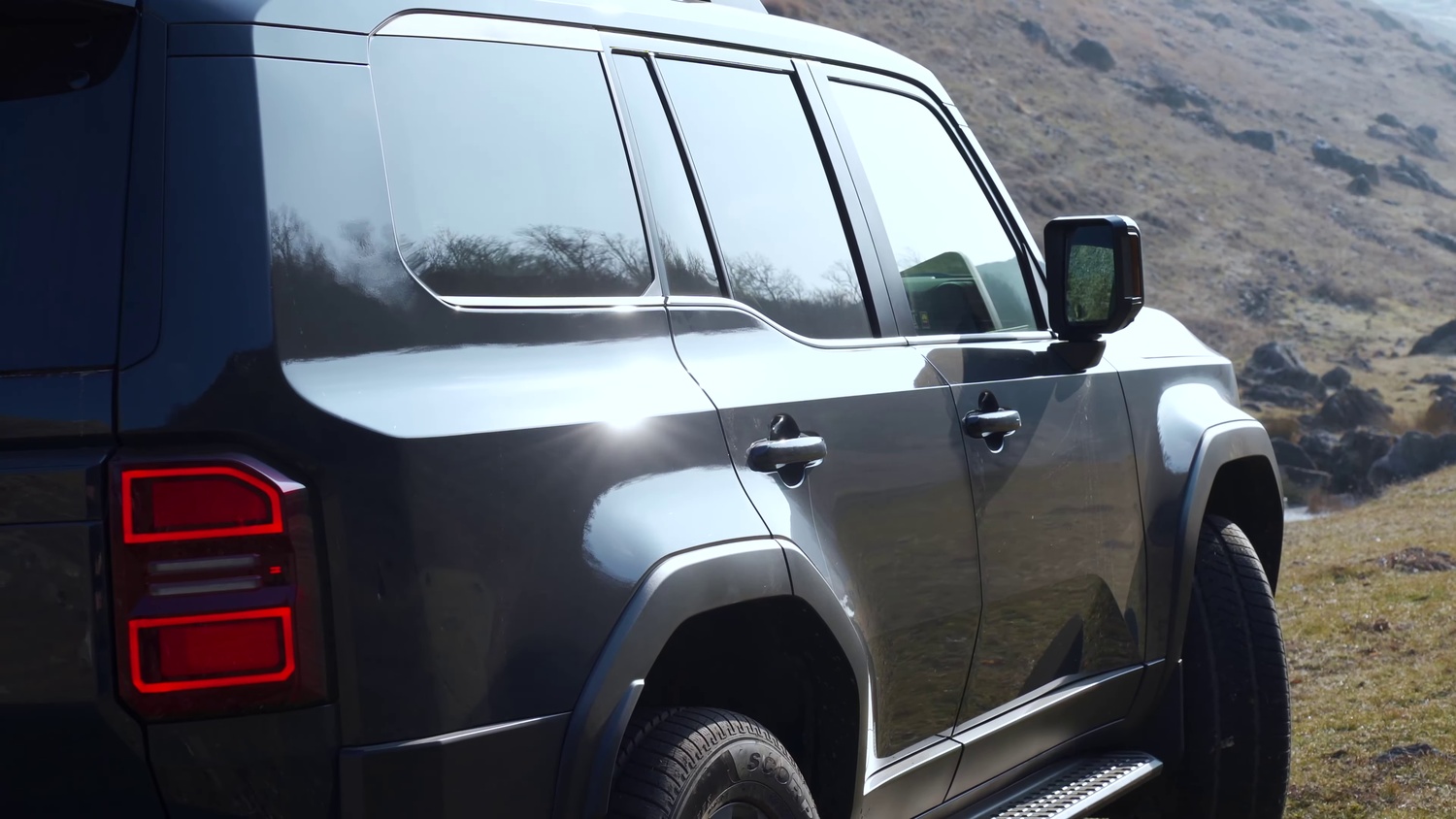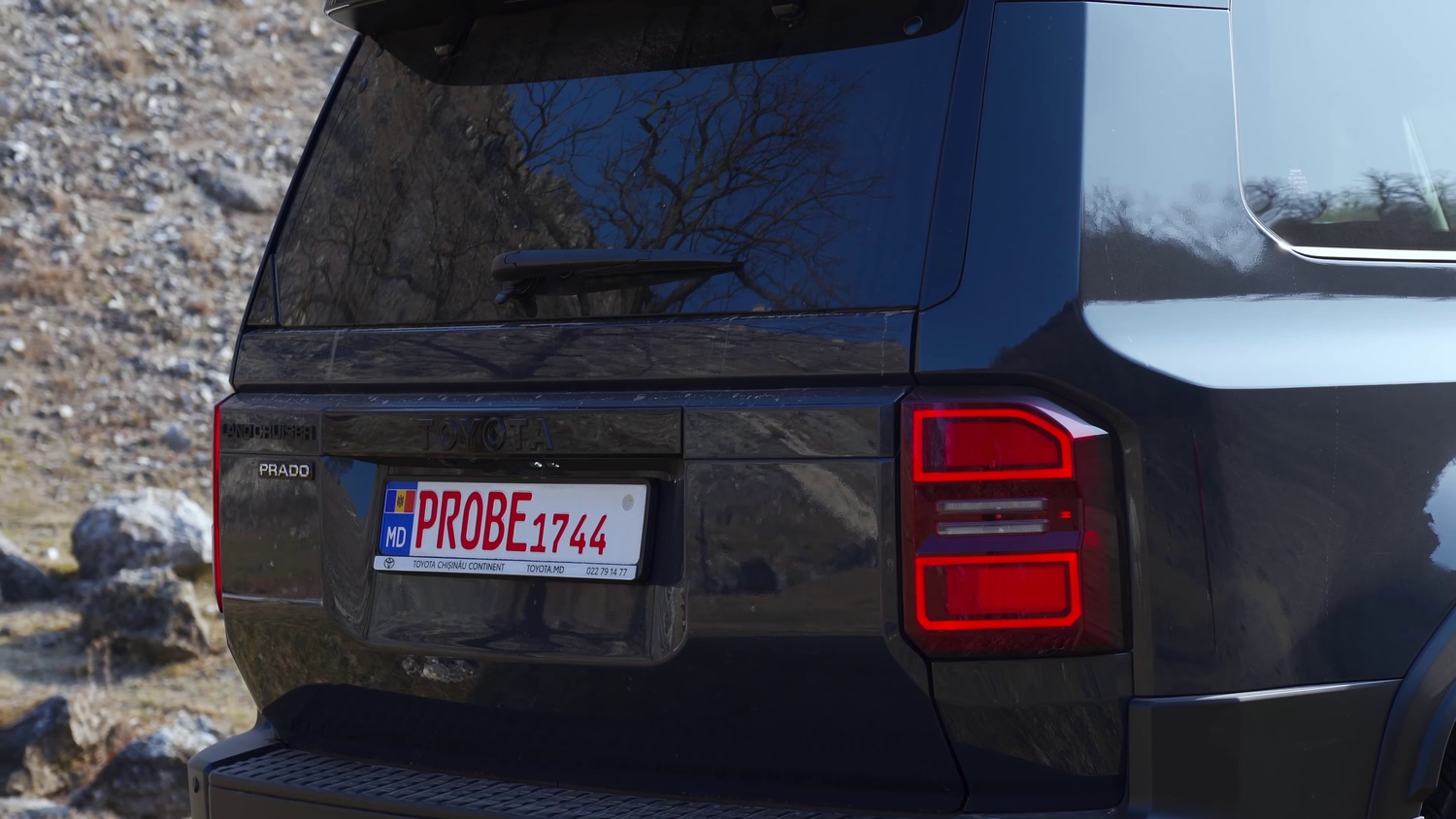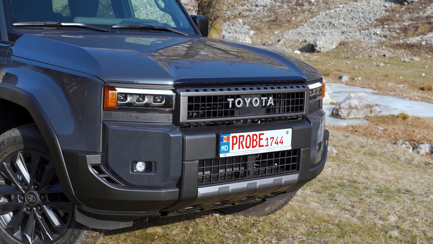 În loc de logoul clasic Toyota, Prado afișează doar inscripția „TOYOTA” pe grila radiatorului și în spate, în stil retro, cu logoul prezent doar pe jante. Oglinzile retrovizoare mari, cu carcase negre lucioase și semnalizatoare integrate, au o sticlă mai mult verticală decât orizontală – un detaliu care necesită obișnuință.