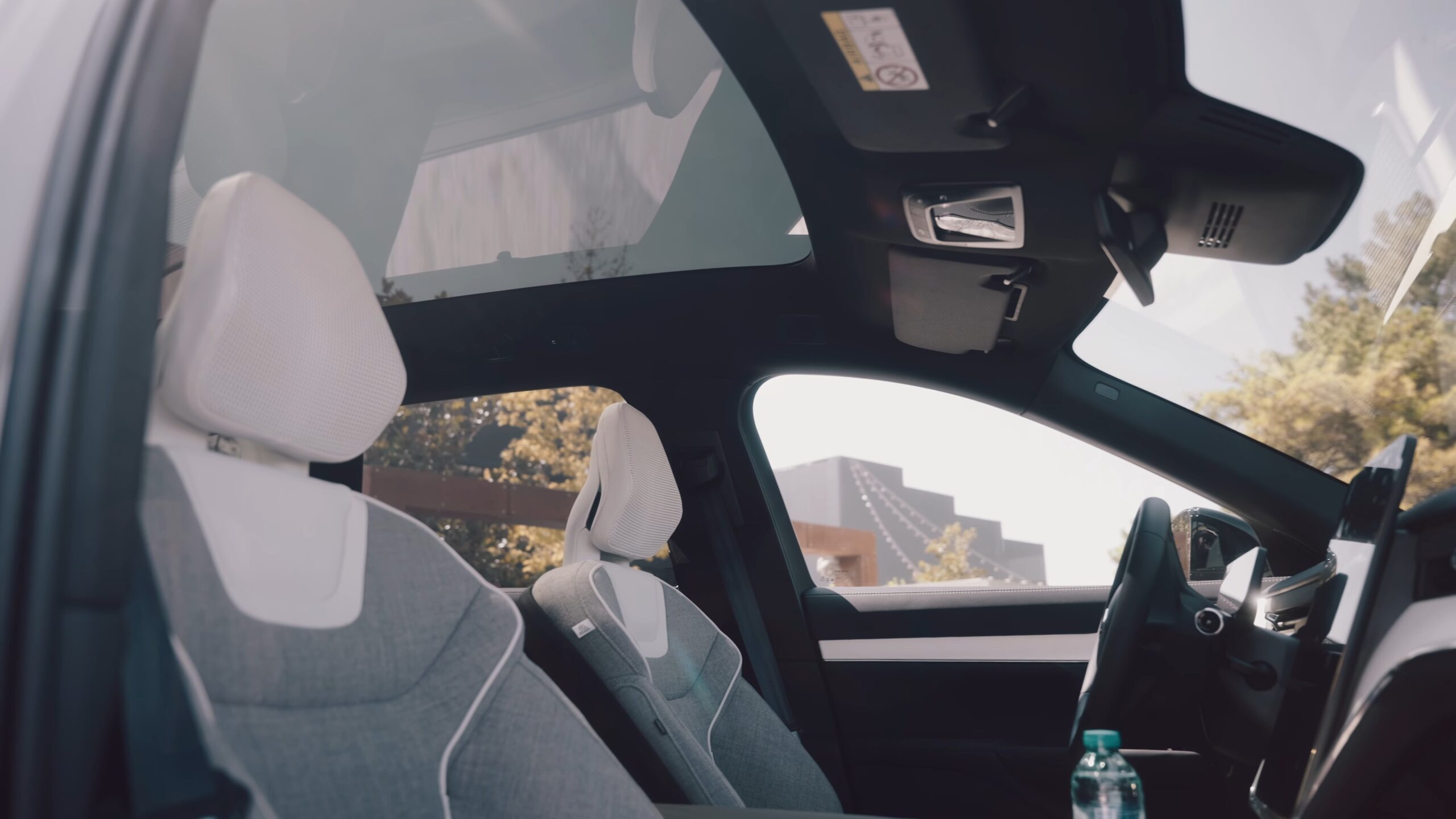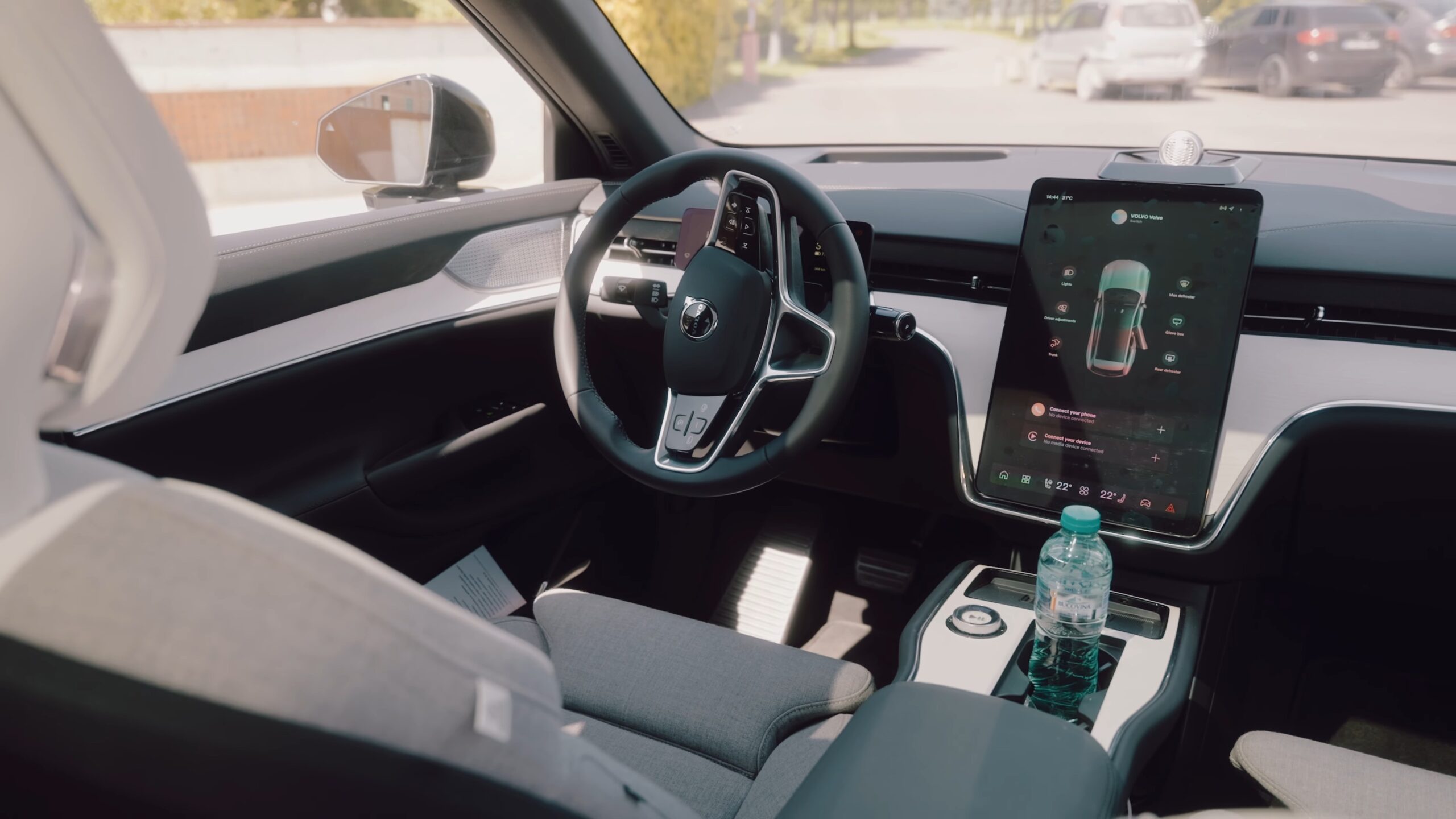 Interiorul lui EX90 reflectă stilul scandinav: minimalist, funcțional și elegant. Scaunele, tapițate cu un material textil din lână (fără piele naturală, conform angajamentului eco), sunt confortabile, dar lipsa ventilației a fost simțită în zilele toride de 33°C. Planșa de bord integrează un material inovator din plastic reciclat combinat cu așchii de lemn din tăieri programate în Finlanda și Suedia, oferind o textură premium, asemănătoare lemnului.