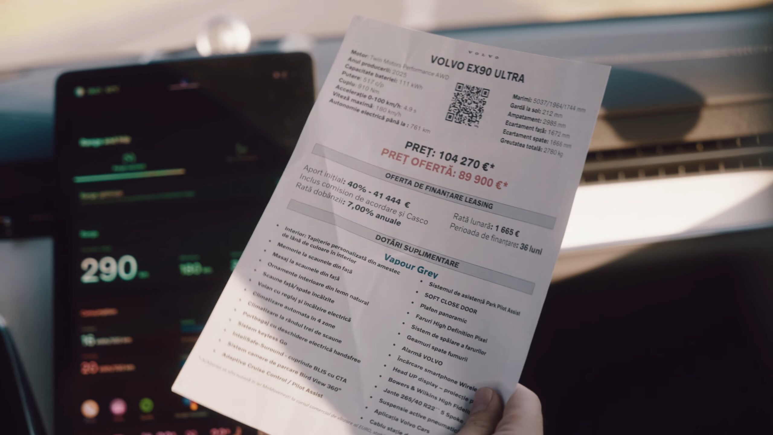 Prețul de listă al lui Volvo EX90 este de 104.270 €, dar la ofertă actuală costă 89.900 € (valabilă până la 31 decembrie 2025). De notat că prețul este pentru modelul în versiunea de top cu 517 CP, capabil de 0-100 km/h în 4.9 secunde.