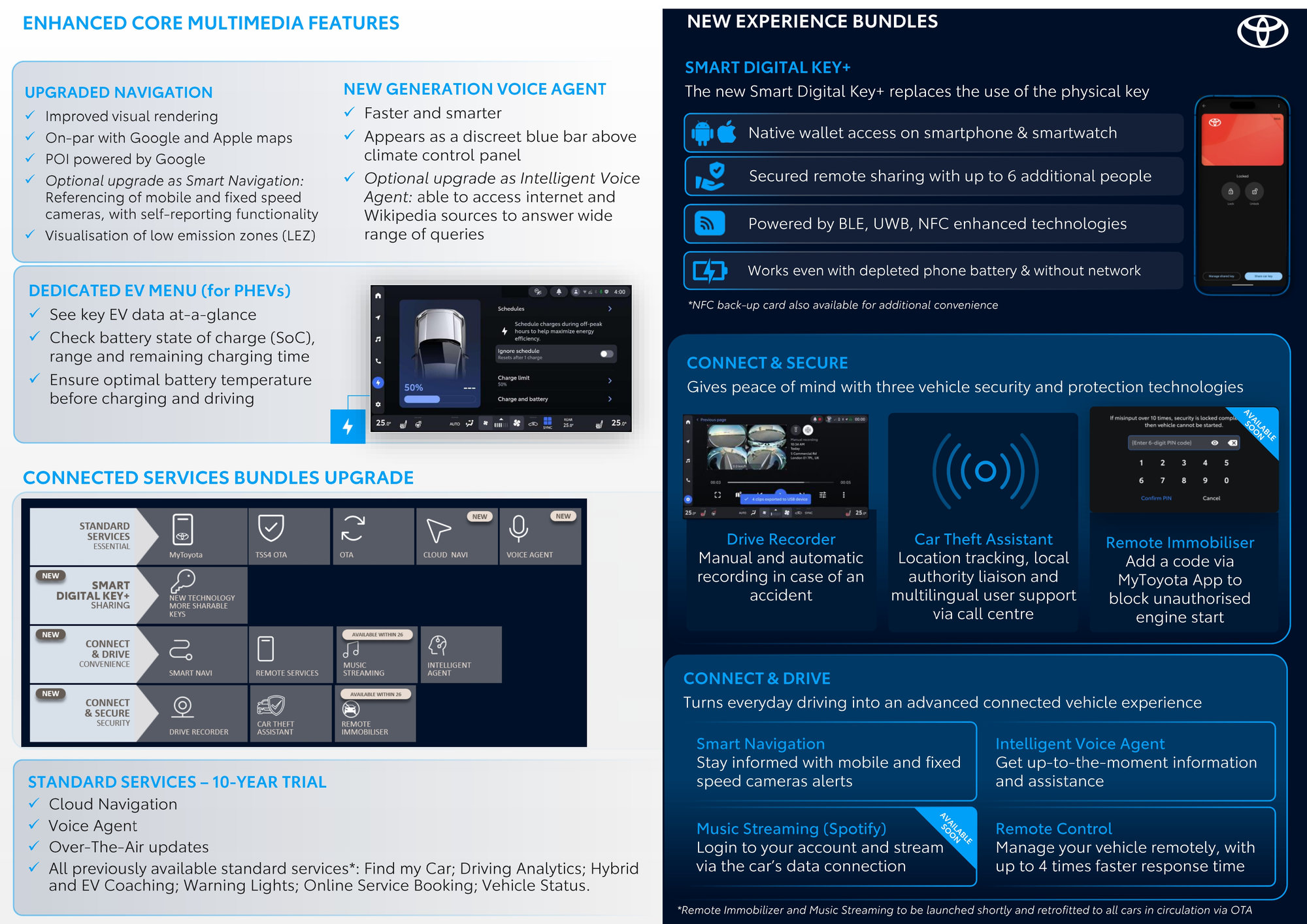 Toyota introduce pentru prima dată platforma Arene, care permite actualizări OTA (over-the-air) frecvente pentru multimedia, servicii conectate și Toyota Safety Sense.
