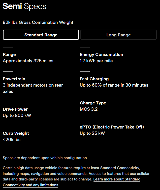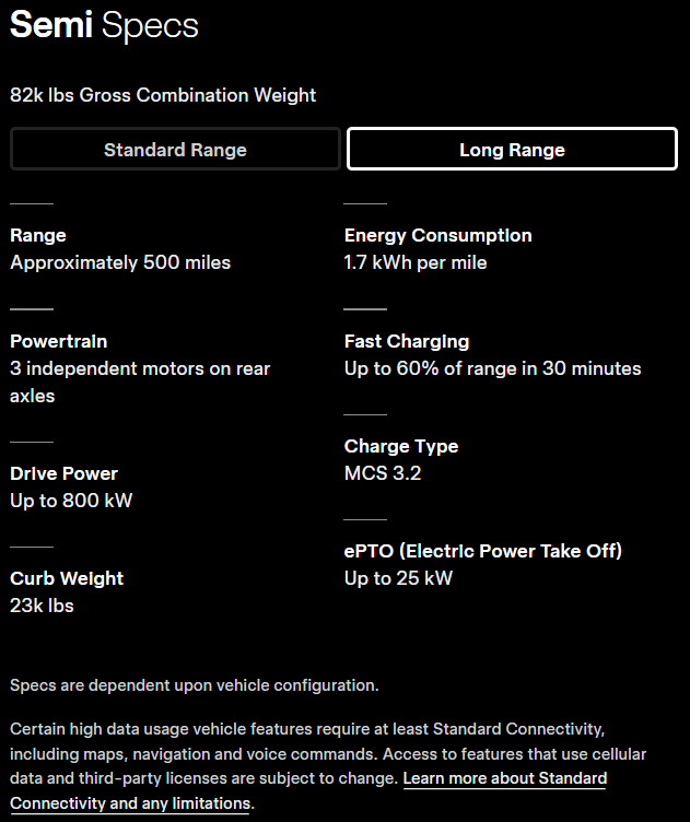 Tesla Semi este disponibil în două versiuni. Modelul standard are o autonomie de aproximativ 525 de kilometri cu o încărcătură completă (puțin peste nouă tone greutate proprie și alte 28 pe care le poate trage).