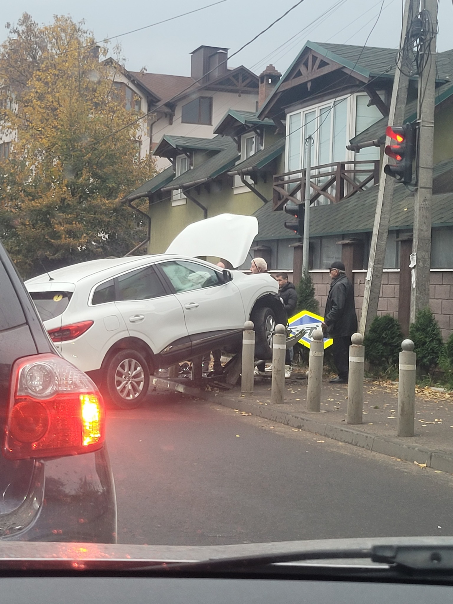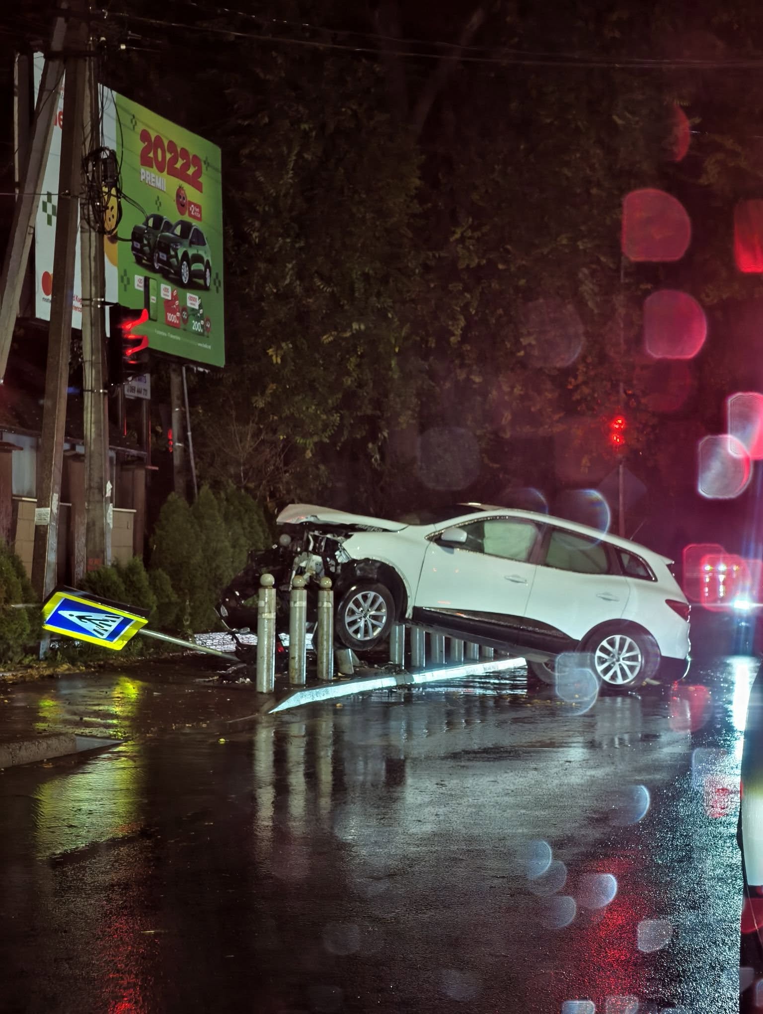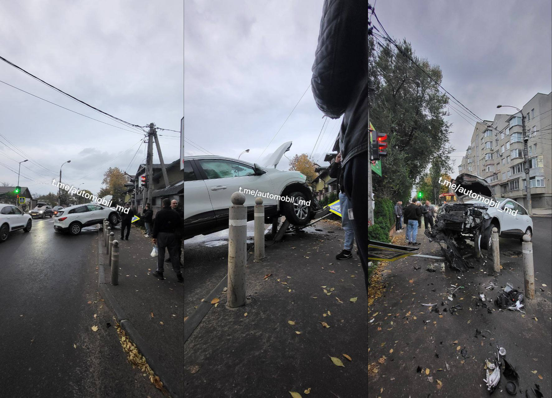 În rezultat s-a izbit puternic de pilonii care sunt instalați acolo pe trotuar, pentru a proteja gospodăria din preajmă, după ce anterior au mai avut loc accidente de genul și mașinile intrau în gardul casei. Kadjar-ul de culoare albă s-a ridicat cu partea frontală peste piloni, iar pernele de aer evident s-au declanșat. După câteva secunde cei doi tineri din habitaclu au putut părăsi cabina și chiar nimeni nu a avut de suferit.
