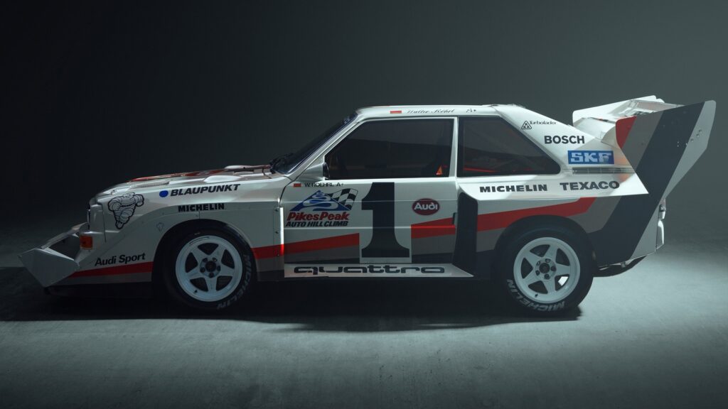 Audi a creat un automobil care amintește instantaneu de legendarul Audi Sport quattro S1, modelul pe care germanii obișnuiau să-l mişte până la vârful muntelui în celebrul eveniment Pikes Peak Hill Climb. În 1987 Walter Röhrl a câștigat cursa organizată în statul Colorado la volanul acestuia.