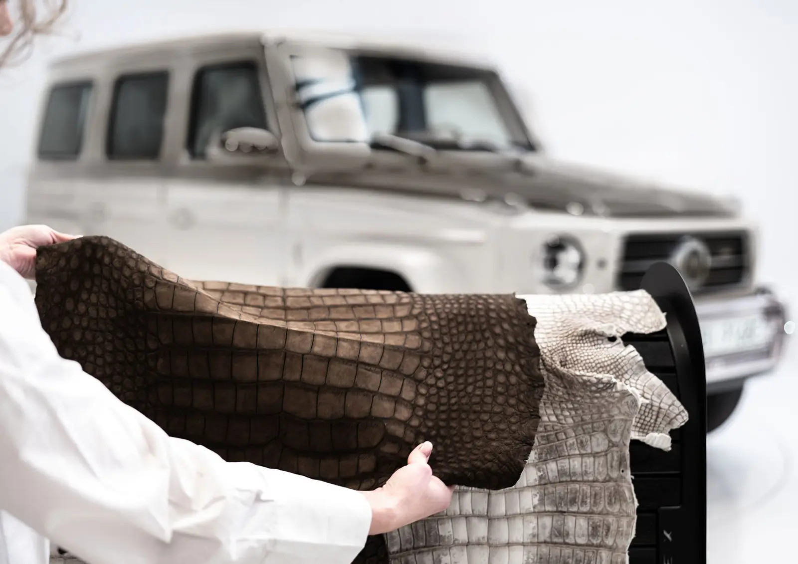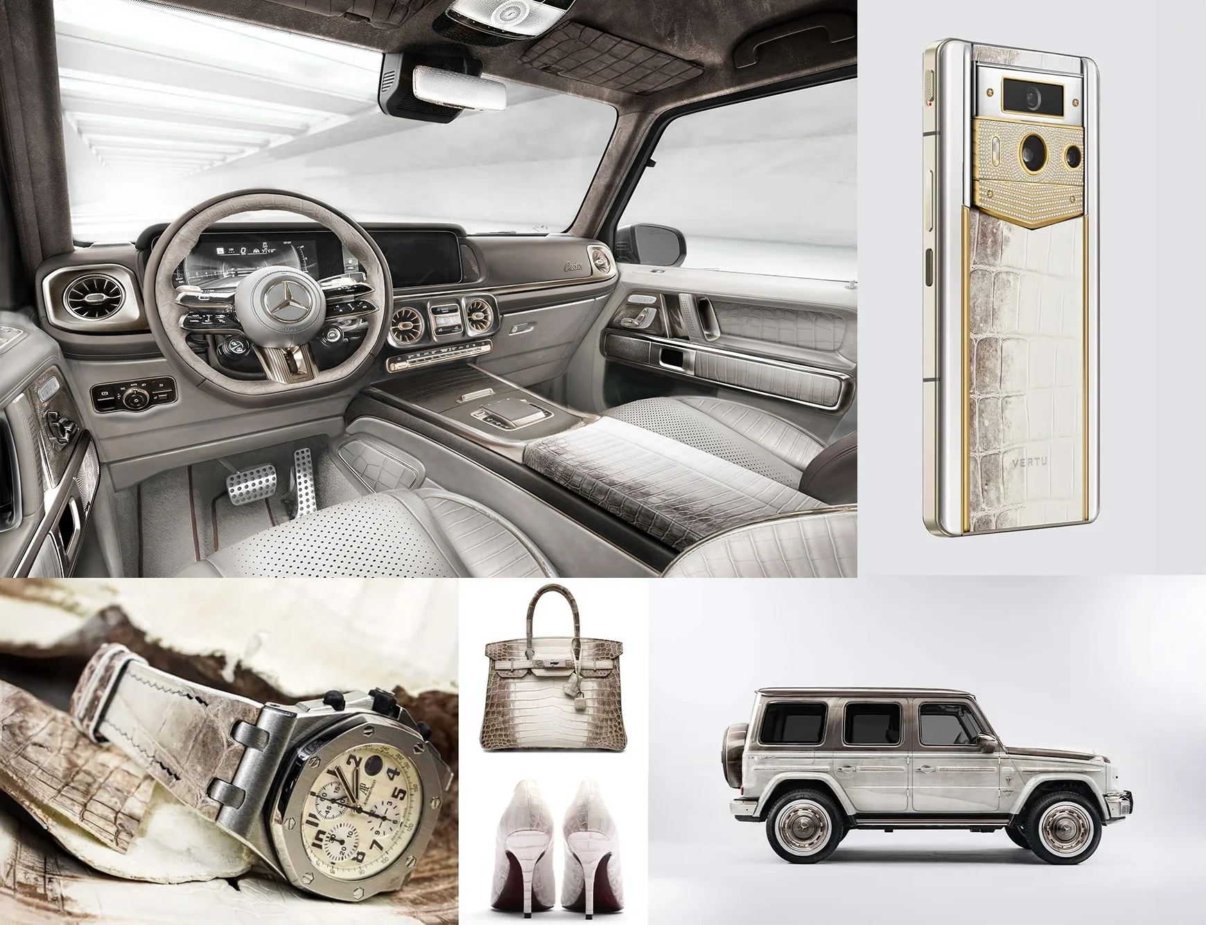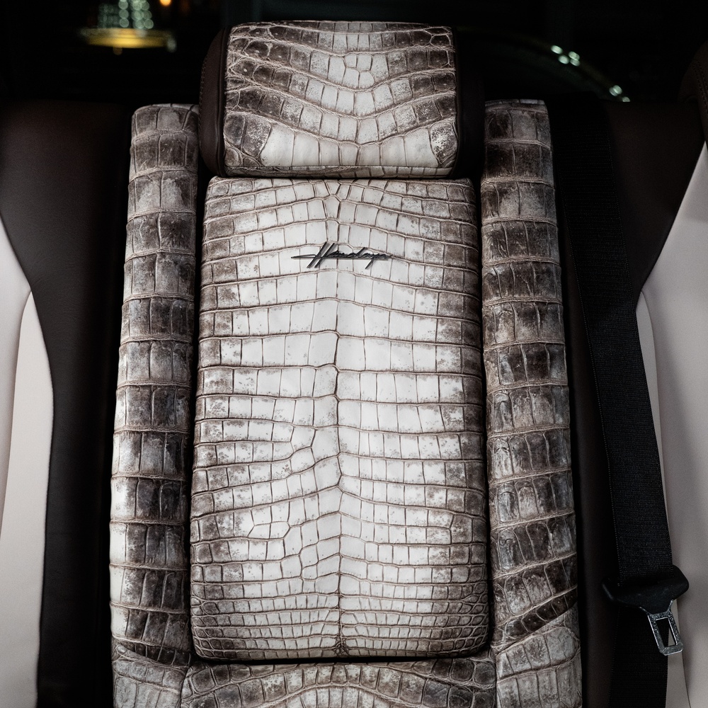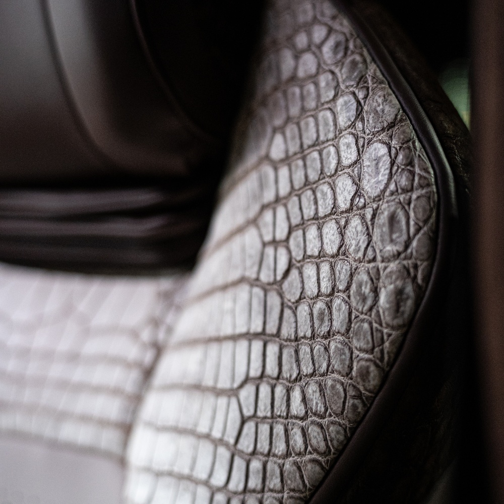 Interiorul dezvăluie o orchestră a celor mai rare materiale din lume. Pielea evazivă Himalaya – cunoscută din legendarul Hermès Birkin – se întâlnește cu pielea de porțelan de claritate impecabilă și porosus nubuck, o piele exotică a cărei moliciune și textură aparțin altei lumi. Fiecare element este finisat manual, selectat nu pentru spectacol, ci pentru semnificație.
