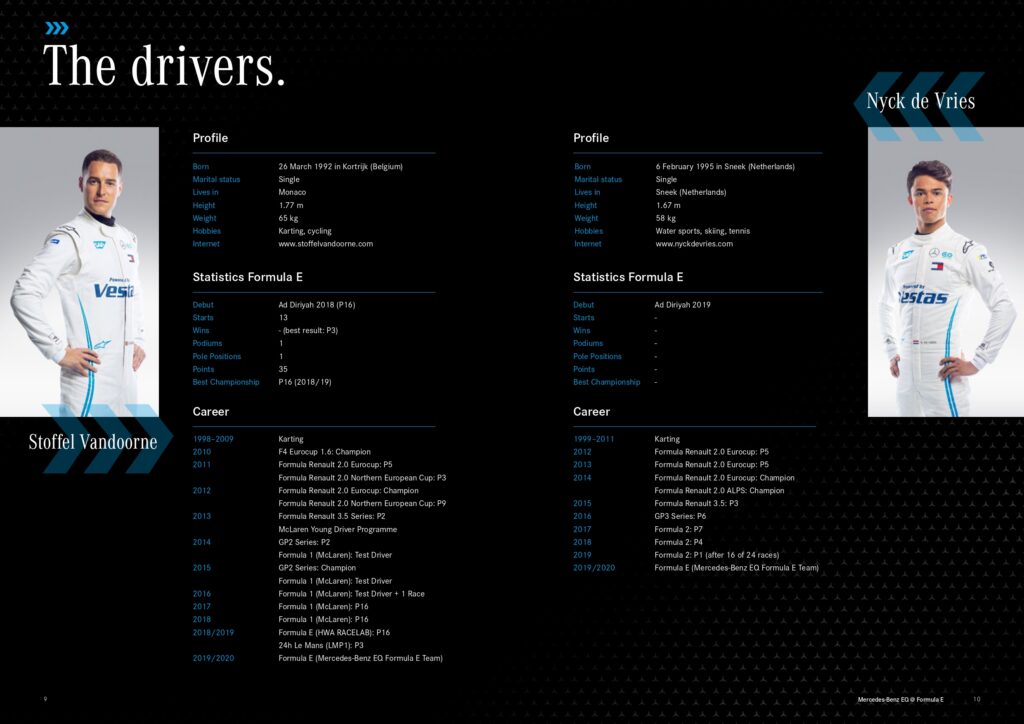 Echipa are denumirea completă Mercedes-Benz EQ Formula E Team. Lider a fost numit Ian James, iar în calitate de piloţi au fost aleşi Stoffel Vandoorne, ex-pilot de Formula 1 originar din Monaco, dar şi Nyck de Vries – lider actual al sezonului FIA Formula 2!