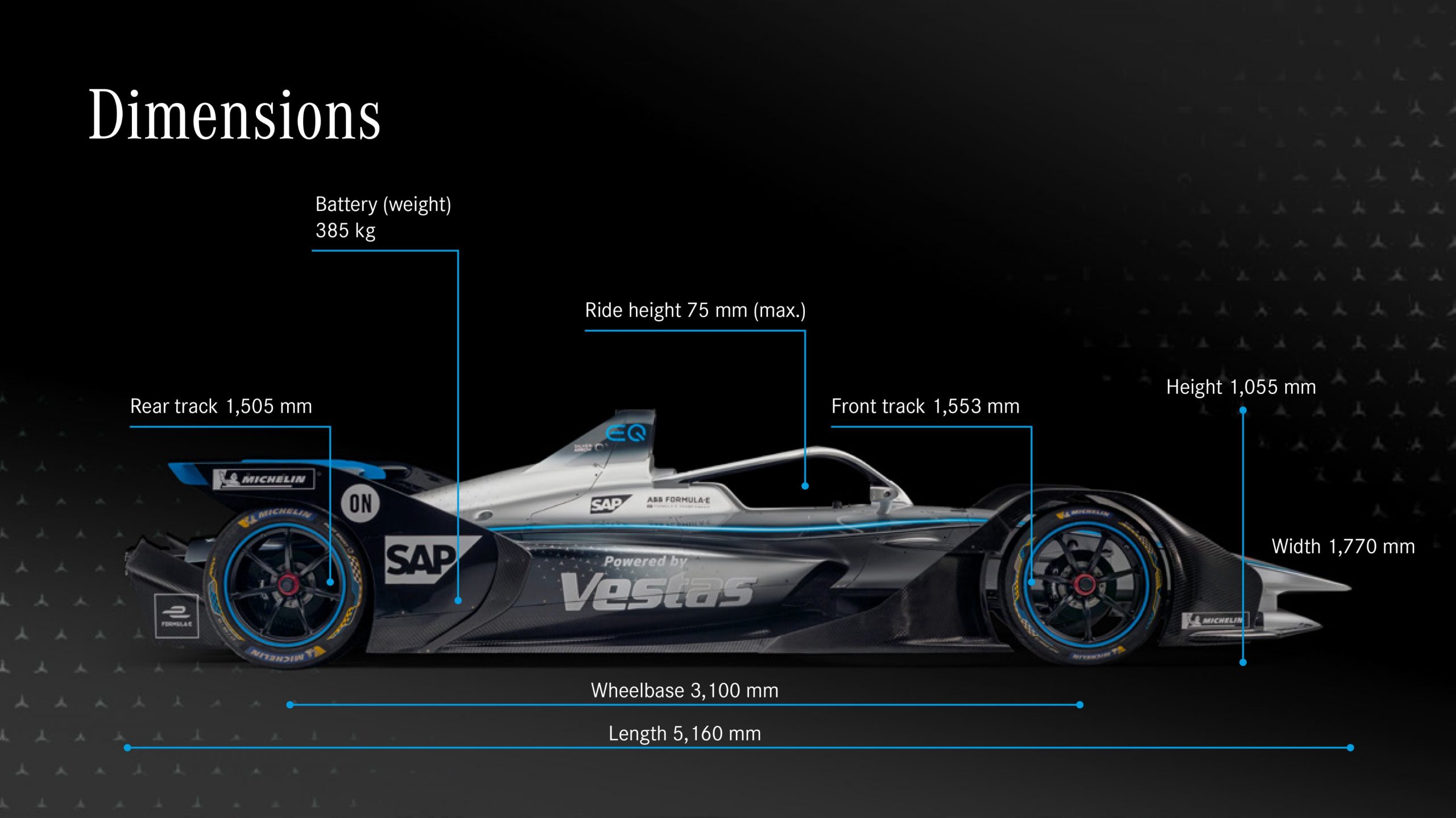 Livreaua bolidului electric a fost realizată în stilul celei găsite pe monoposturile sale din Formula 1: tonuri tradiţionale negre-gri şi cu accente în turcoaz.
