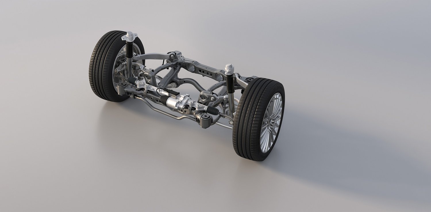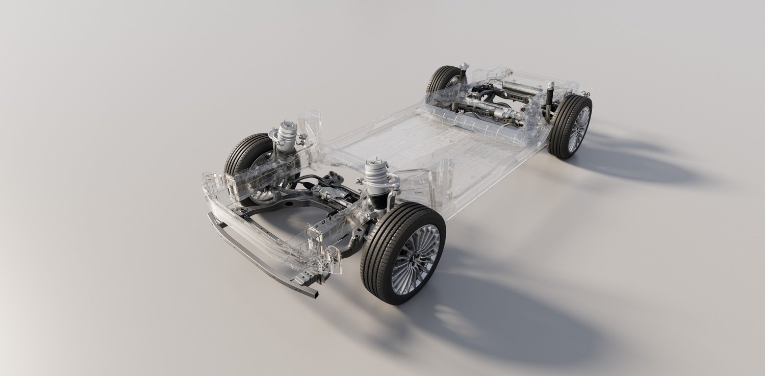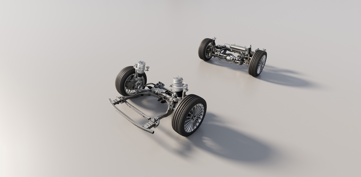 - Suspensie complet independentă, standard cu arcuri pneumatice cu cameră dublă (dezvoltată intern, cu cinci trepte de înălțime, cursă de 100 mm) și amortizoare adaptive EDC (dezvoltate intern, ajustare în milisecunde).