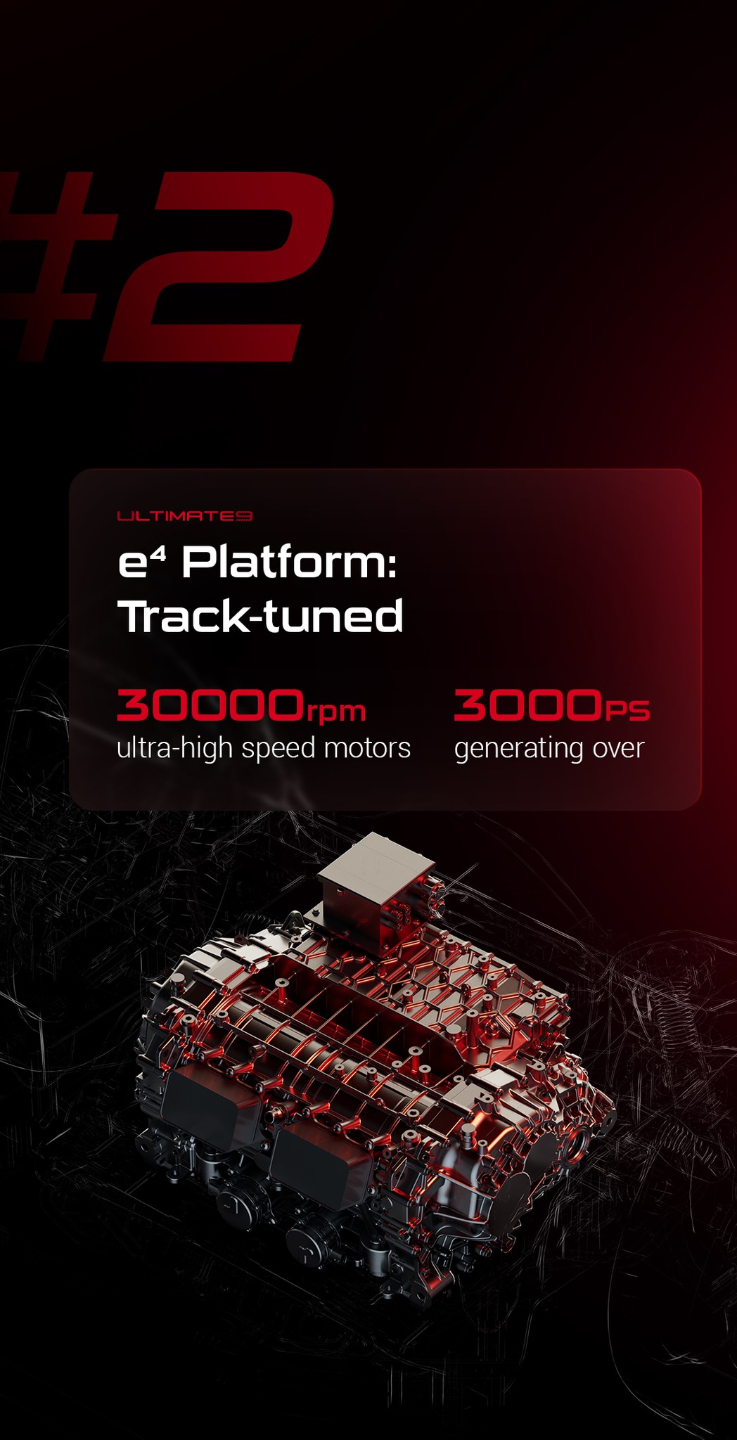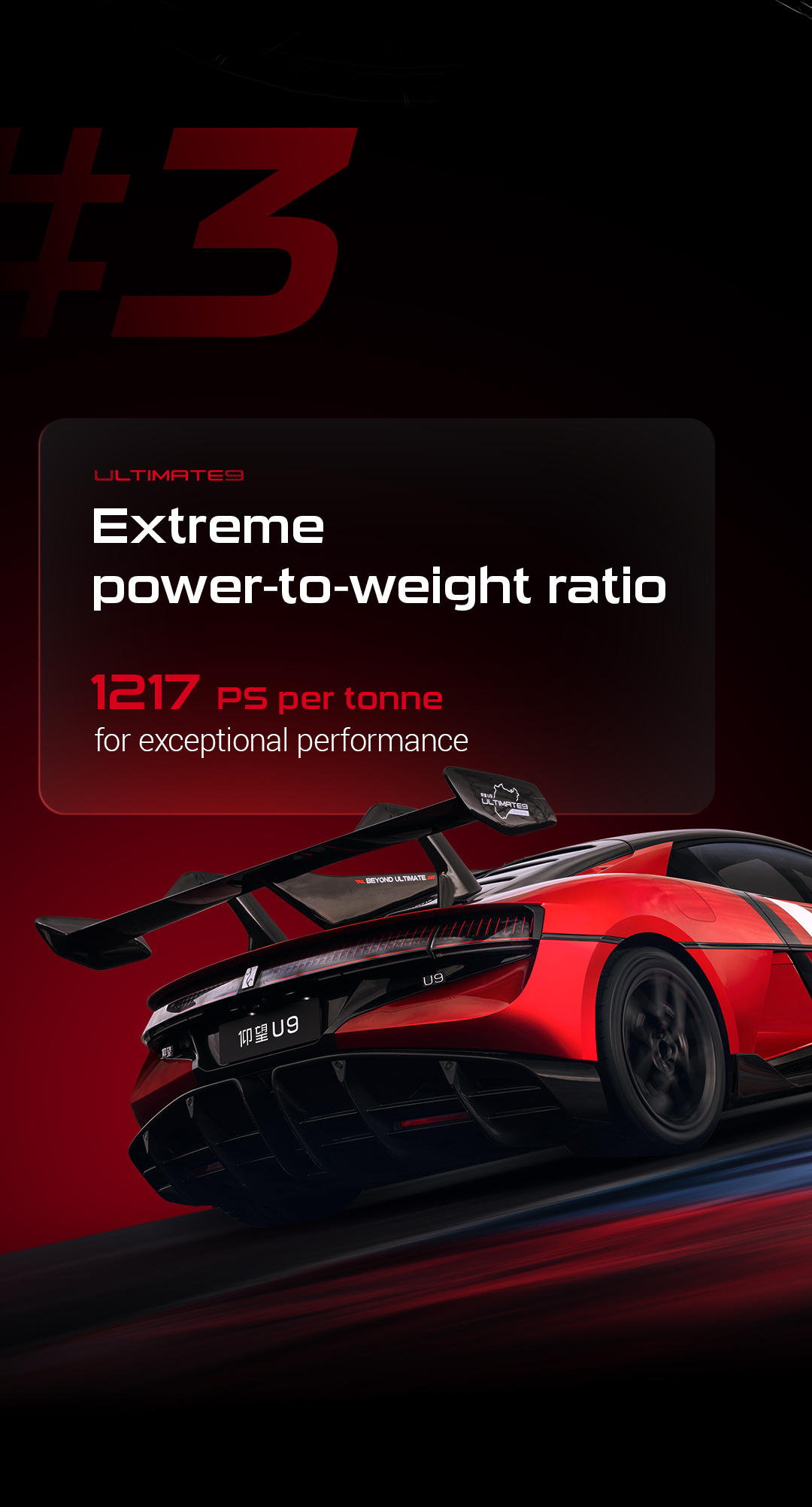 Această configurație ridică performanța la niveluri nemaiîntâlnite, oferind o putere maximă de 555 kW per motor, datorită sistemului quad-motor capabil de 30.000 rpm – o premieră mondială. Cu o putere combinată de 3018 CP și un raport putere-greutate de 1217 CP per tonă, U9 Track Edition se alătură elitelor industriei auto globale.