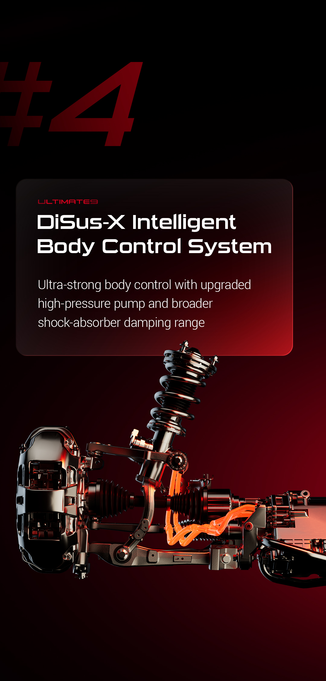 DiSus-X, sistemul inteligent de control al caroseriei, ajustează vertical suspensia fiecărui colț al vehiculului în timpul accelerațiilor agresive, virajelor sau pe suprafețe neregulate. Acest mecanism reduce balansul și ruliul, îmbunătățind confortul și încrederea șoferului, în timp ce optimizează contactul anvelopelor cu suprafața, maximizând aderența. În sinergie cu platforma e4, DiSus-X garantează stabilitate și siguranță excepțională, introducând conceptul inovator de „control al posturii caroseriei” în scenarii de pistă.