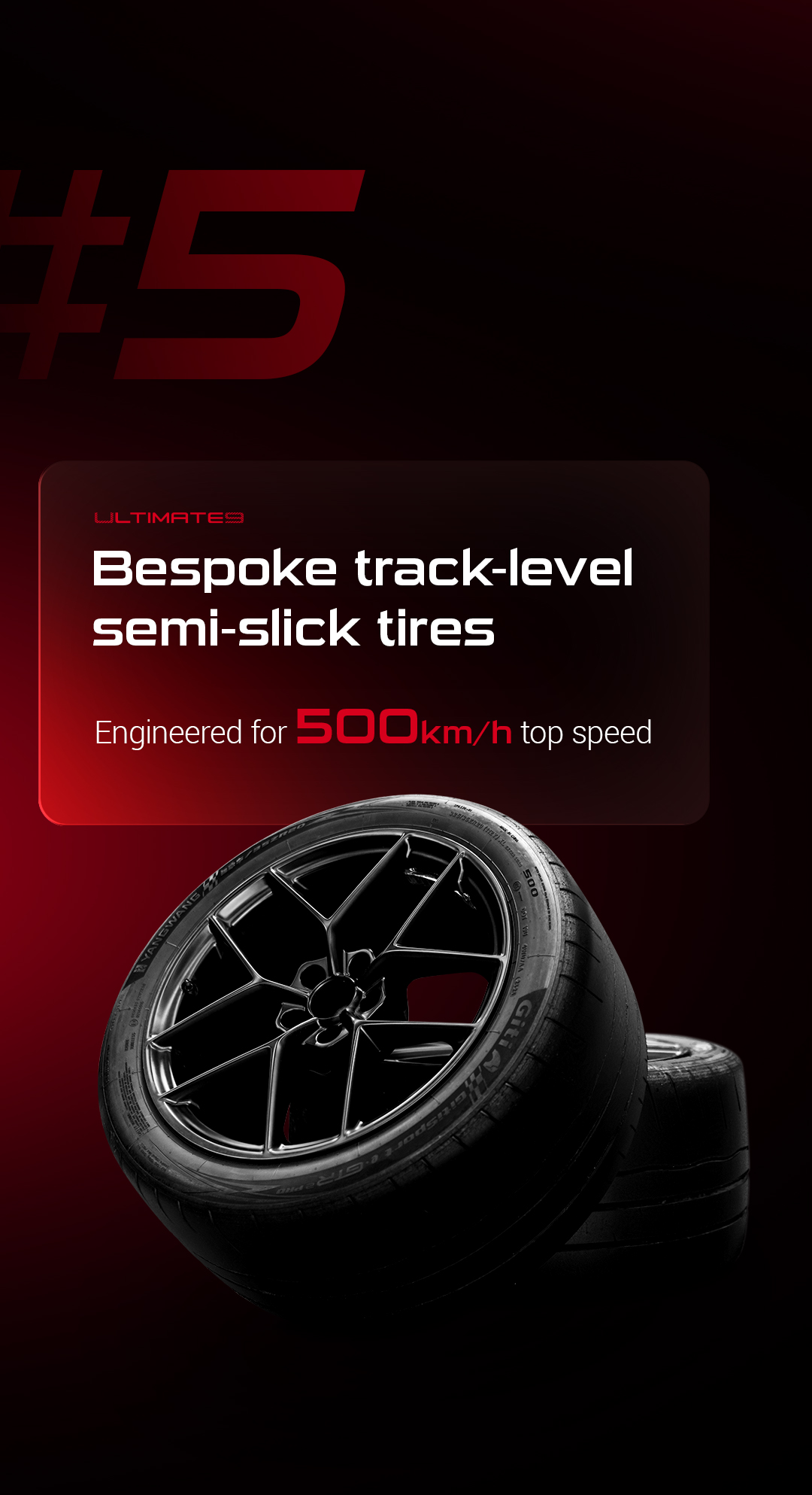 Pentru a face față solicitărilor extreme, Yangwang a colaborat cu producătorul indonezian Giti Tire pentru a dezvolta o anvelopă semi-slick de pistă. Aceasta include materiale compozite optimizate și un design unic al benzii de rulare, iar un tratament de ”knurling” (moletare) la interfața jantei, combinat cu un lubrifiant de înaltă vâscozitate, reduce alunecarea între anvelopă și jantă la accelerație sau frânare.