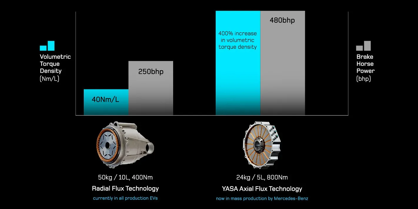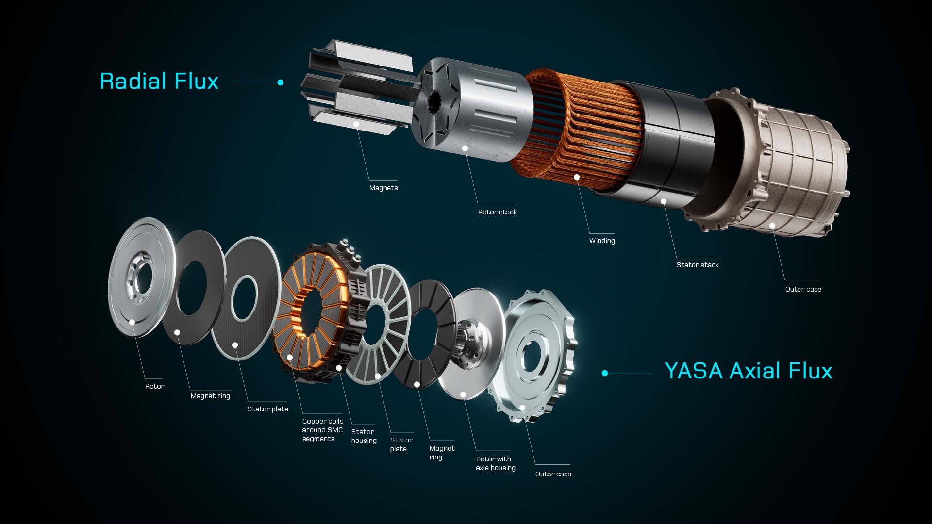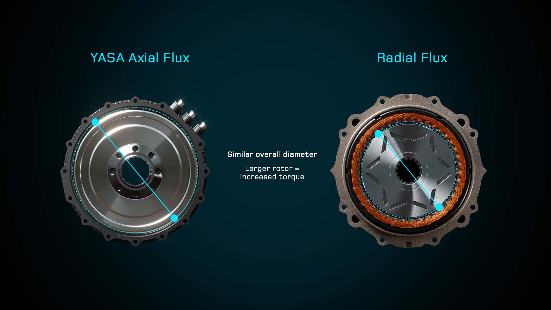 Spre deosebire de motoarele radiale tradiționale (numite altfel cu flux radial), care domină piața vehiculelor electrice în prezent, designul axial (numite altfel cu flux axial) al YASA folosește un rotor de ambele părți ale statorului. Aceasta permite fluxului magnetic să circule într-o singură direcție, eliminând necesitatea unui jug statoric. Bobinele sunt plasate în interior, iar lichidul de răcire umple zonele înconjurătoare, rezultând o eficiență superioară.