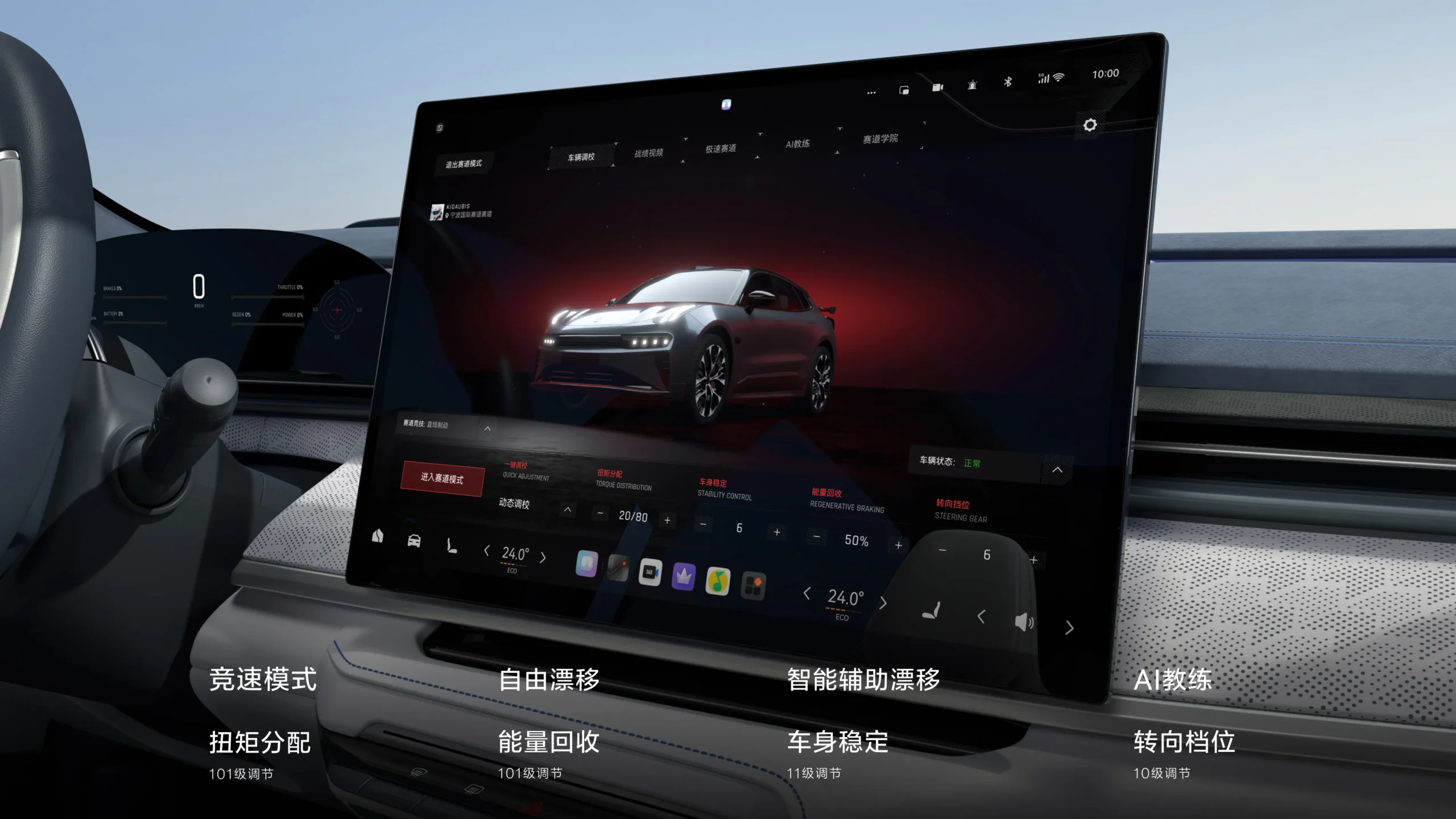 - Actualizarea trenului de propulsie a adus de pe modelul 001 FR software-ul de performanță Zeekr Track. Acesta oferă un: mod de curse cu distribuție a cuplului ajustabil, un mod drift cu recuperare a energiei, 11 niveluri de ajustare a stabilității și 10 pentru direcție.