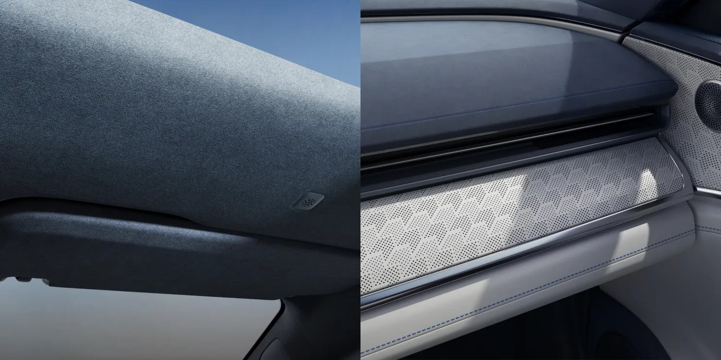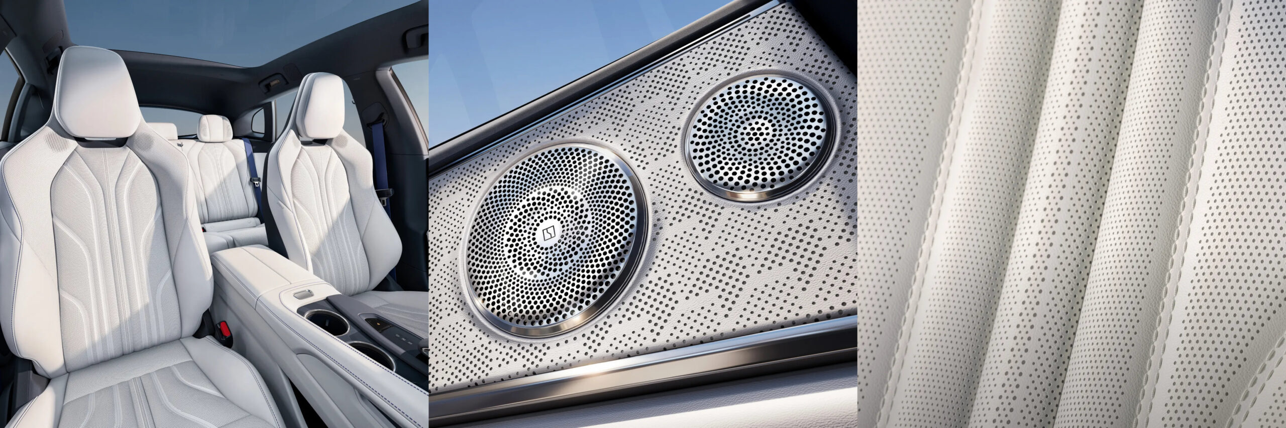- Volanul și scaunele sunt îmbrăcate în piele Nappa. Plafonul este din piele întoarsă. Inserțiile cromate de pe difuzoarele audio sunt din metal real. Scaunele frontale sunt de tip sport, cu tetiere integrate și difuzoare audio la nivelul gâtului.