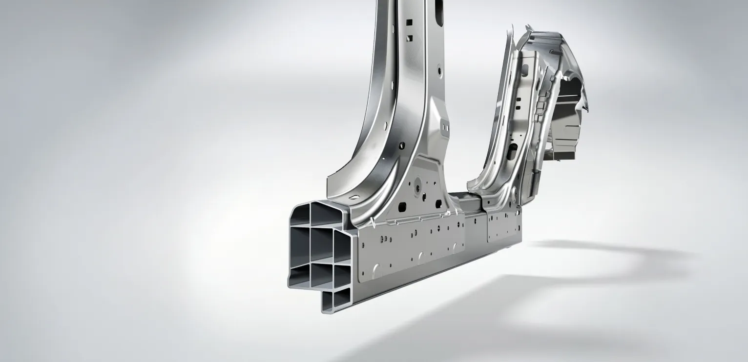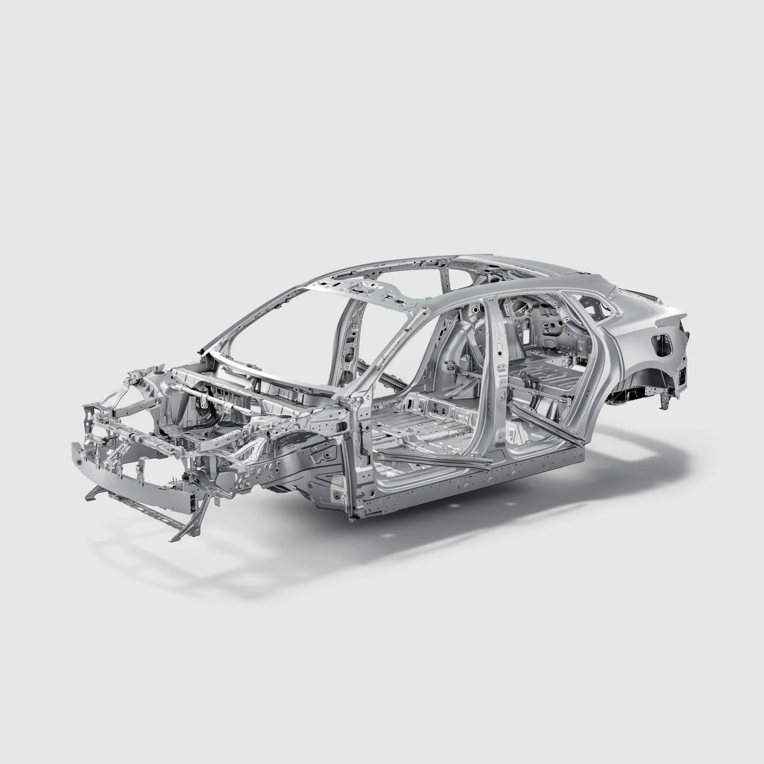 - Caroseria modelului continuă să rămână una dintre cele mai avansate din industrie: este una hibridă formată din oțel-aluminiu de înaltă rezistență. Întregul subcadru posterior este o singură piesă mare din aluminiu turnat sub presiune. Structura laterală anti coliziune din praguri, care este și o protecție a bateriei, conține 10 grile. Montanții frontali sunt ranforsați cu materiale compozite CBS de înaltă rezistență.